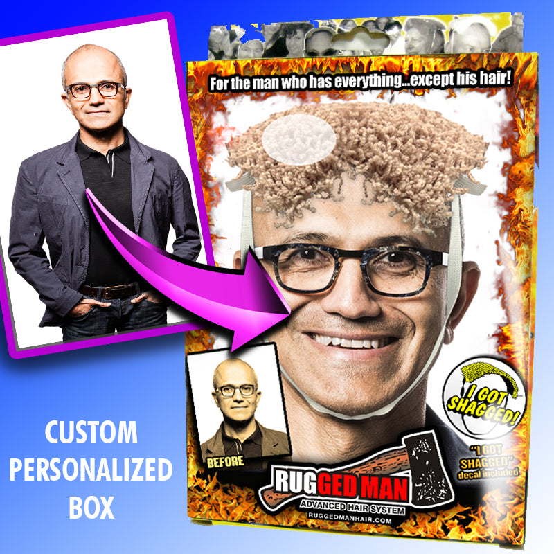 The personalized box contains a before and after of his photo, offering a reminder of his newfound confidence. With the RUGged Man Advanced Hair system, he will find new opportunities, from jobs to dates; plus, with greater self-assurance,. Plus, he won't fear Wind, Water, or Women. A scientific marvel!